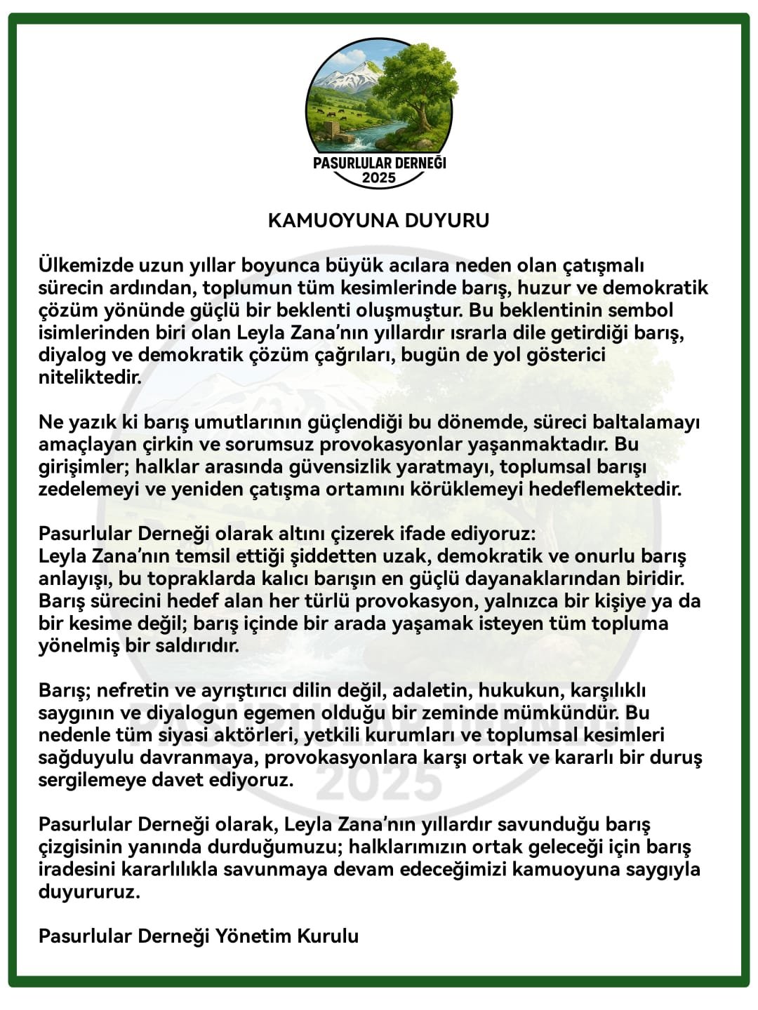 Pasurlular Derneği olarak, Leyla Zana’nın yıllardır savunduğu barış çizgisinin yanında durduğumuzu; halklarımızın ortak geleceği için barış iradesini kararlılıkla savunmaya devam edeceğimizi kamuoyuna saygıyla duyururuz.